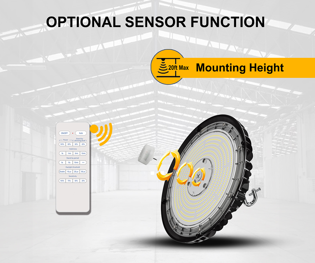 Replace the black cover with the motion sensor on the bottom, then you can get an easy motion sensor high bay light. The sensor detection distance is around 38ft, when you walk into the area, the light will turn on; when you walk out of this area, the light will turn off after 5 seconds.