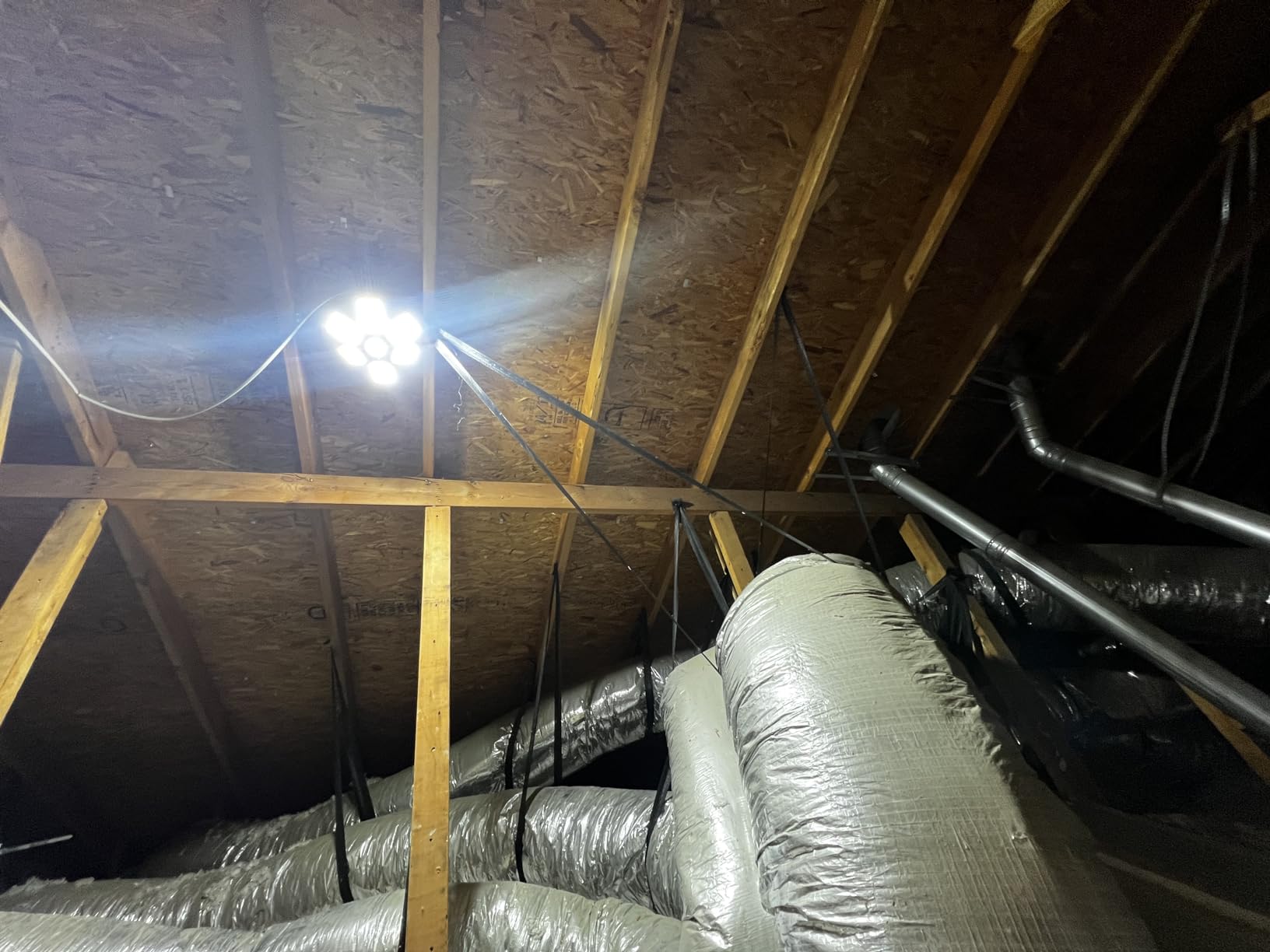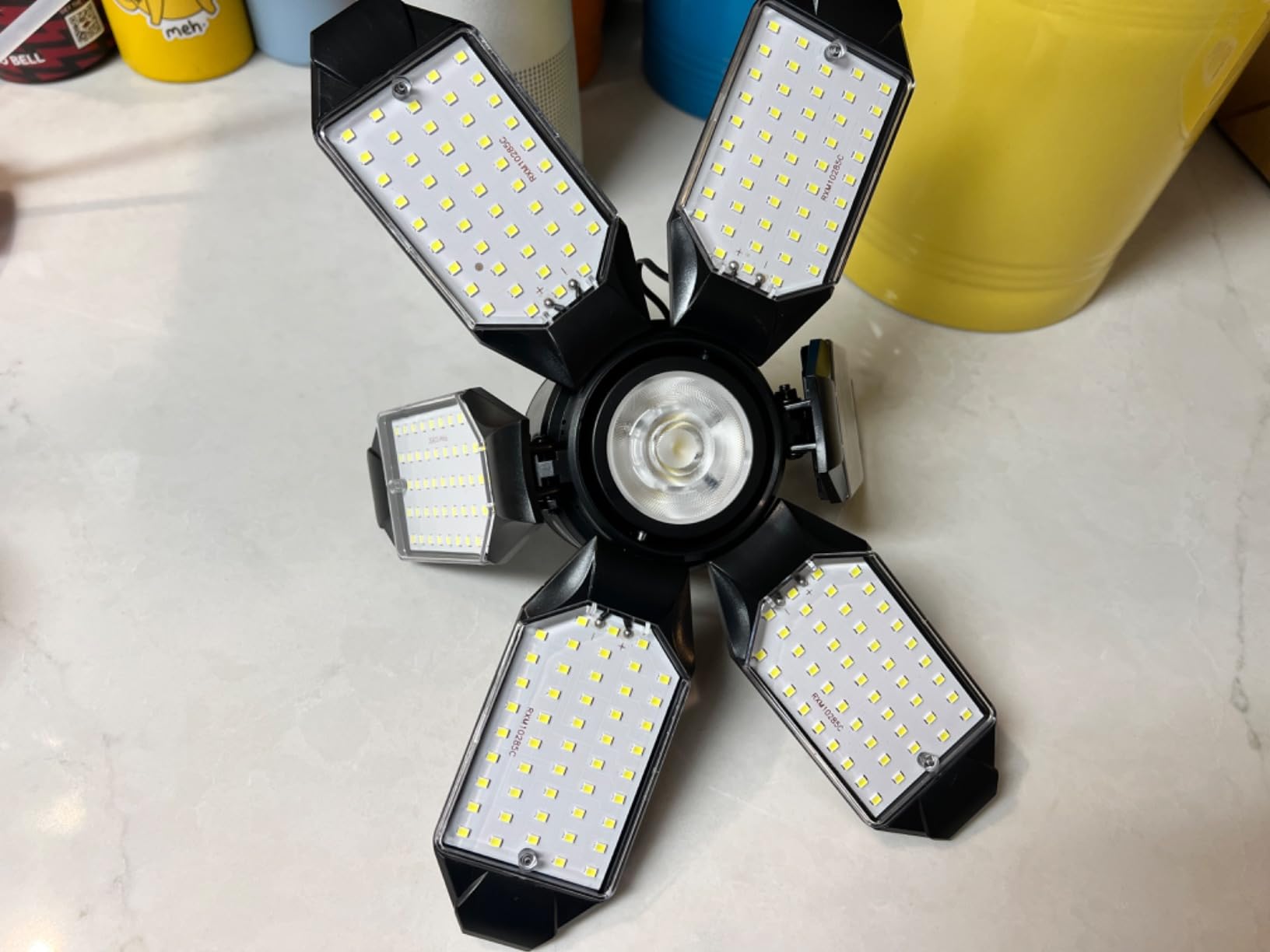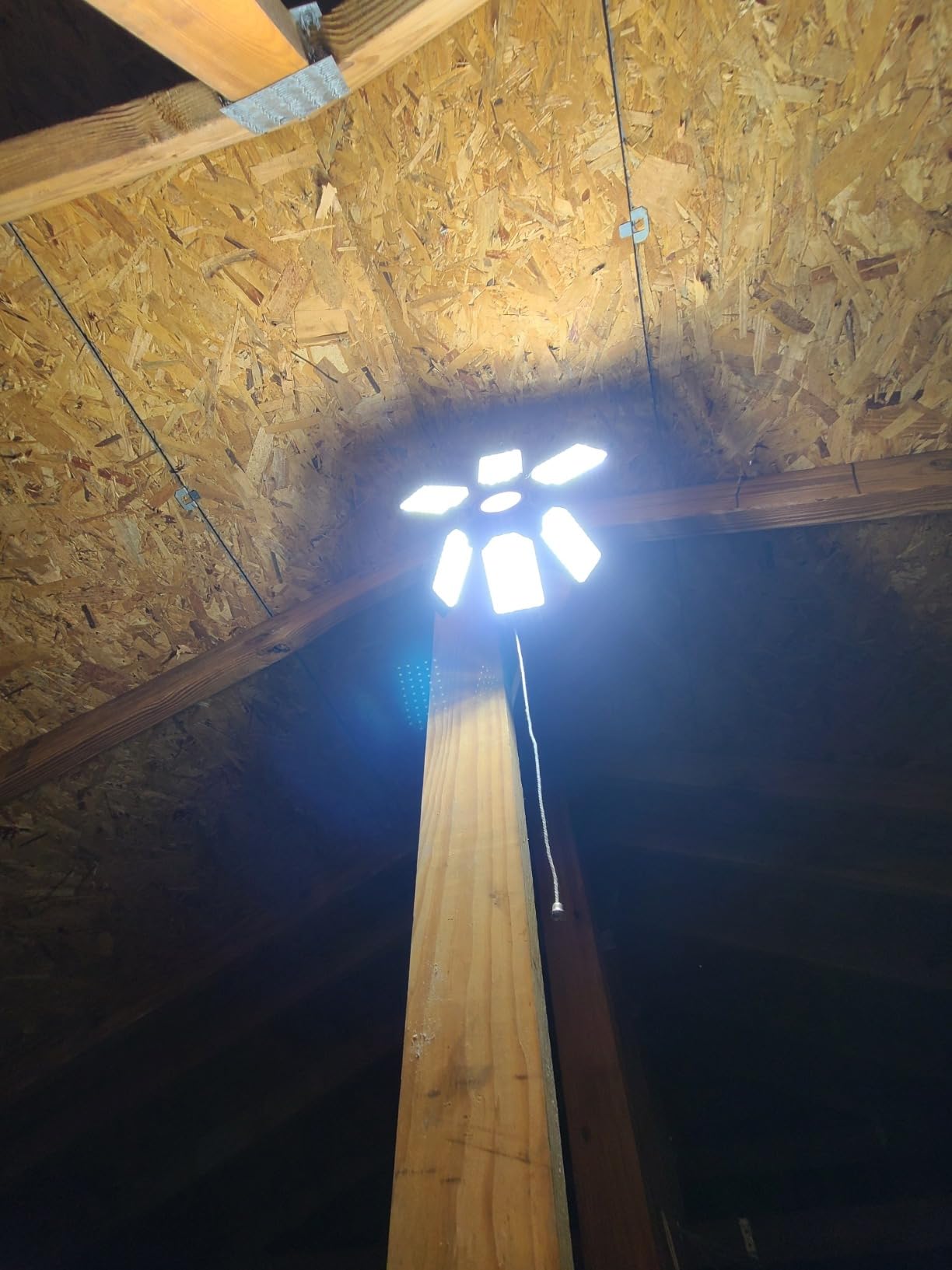 Powerful LED lights for the garage or attic. When I first got the Adiding light package, I was worried. The package was small and could fit it the palm of my hand, however as I unboxed the light I realized why, unlike similar garage lights, the led panel blades can be folded completely up. With the LED panels folded out and compared to other similar garage lights (see pictures), the Adiding is pretty much the same size. We have a huge attic and since it’s walkable, I end up doing various home improvement projects such as installing recessed lighting, working on the air conditioners/furnaces or water heater. My old fluorescent bulb wasn’t cutting it and I installed this garage light there. The 6 adjustable panels really help directing the light where it needs to go, there is also a center light which helps if all your panels are pointing away (a more unique feature to this brand). Overall this is a really bright and easily adjustable LED light.