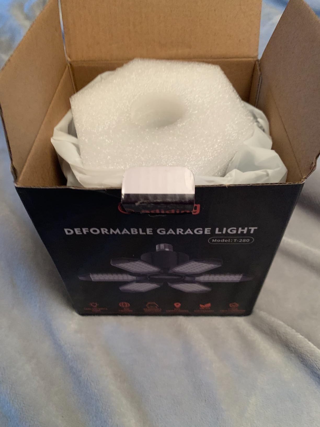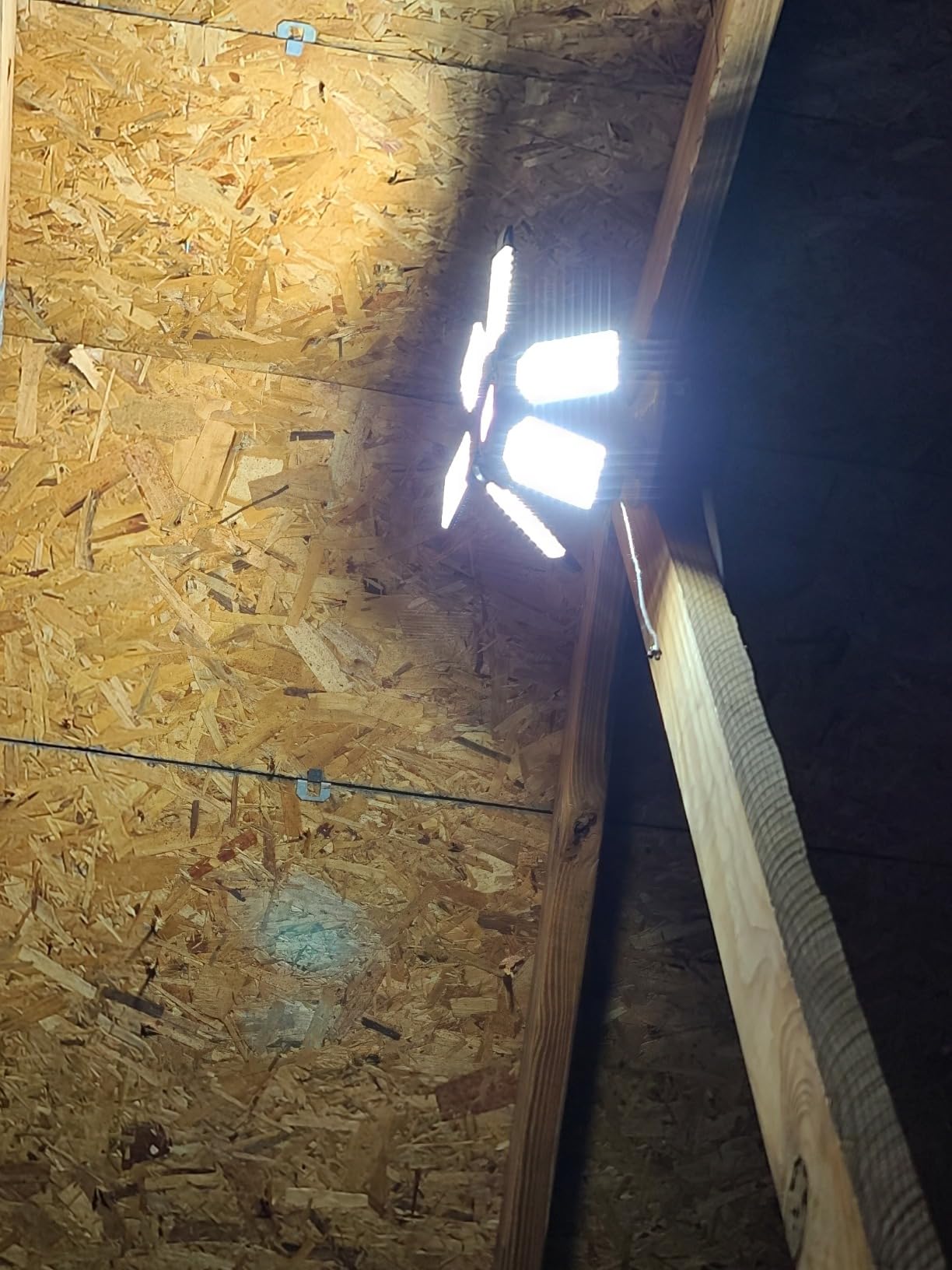 Lights up like a Solar Flare! The Adiding LED Garage light is a very bright and useful light. As you can see I have a picture of my old fluorescent bulb and then pictures of the new LED bulb. It uses a standard size bulb receptacle and screws in just the same. As you can see it is a directional bulb and the outer leaflets must be positioned to your liking to send the light in the places you want.