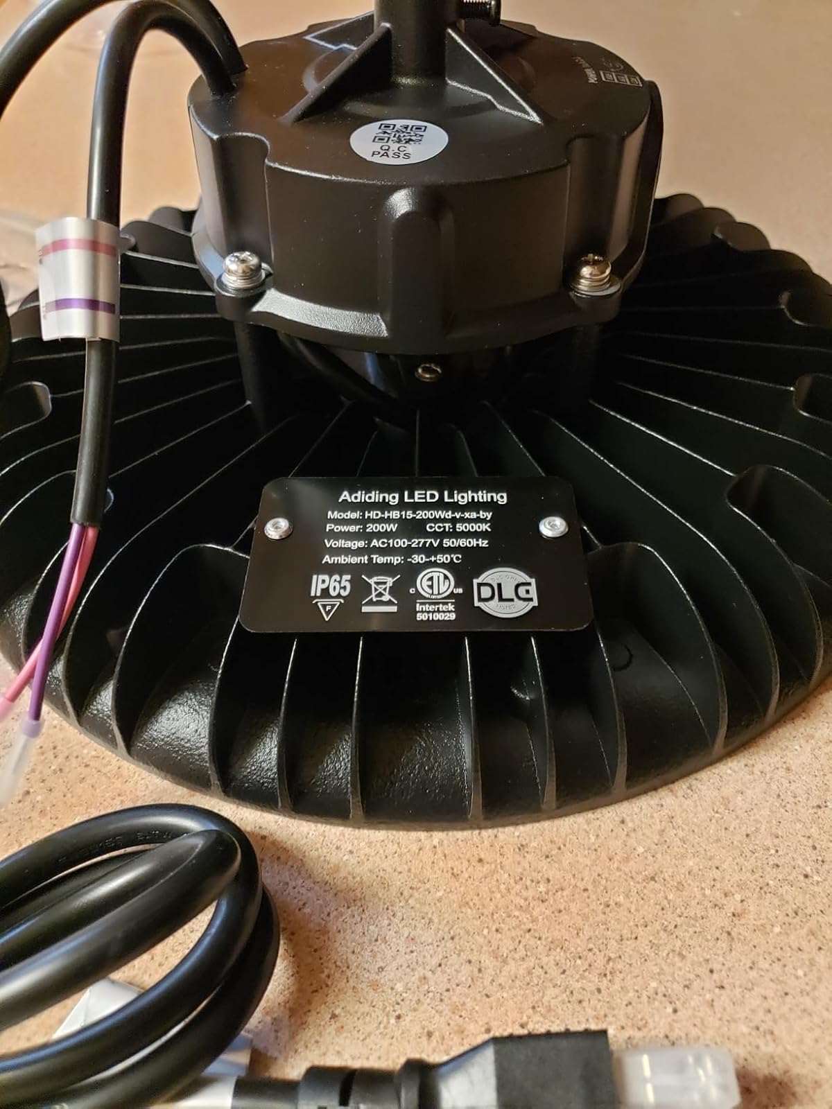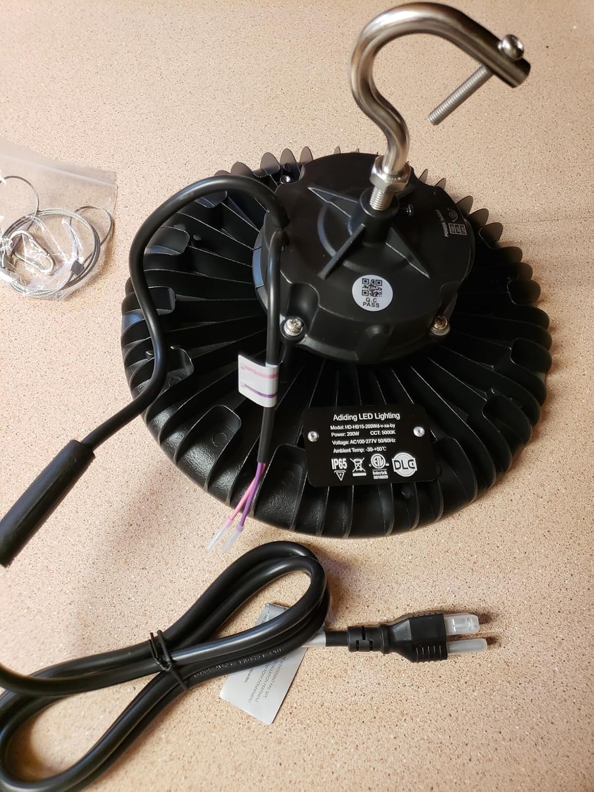 Ordered this 200W LED High Bay Light - Wattage Adjustable UFO LED Warehouse Light, 200W LED Light for my recent refurbished shop. I recently took out the small work bench in my shop as I needed a larger work bench. I constructed the new one larger and stronger (3' x 20') as I work construction equipment and trenching machines and all parts & etc. are heavy duty and heavy steel made parts. Also needed better lighting than my old (2) florescent bulb lights that I have kept constantly buying bulbs, ballast and replacing. Recently, while shopping online for other shop items, I saw this 200 watt LED round high bay light that hangs from ceiling and ordered it. Love this light. I put it at the ceiling over workbench. I like the cast aluminum housing. Also like that the driver base is raised up over the base for good heat dissipation. Really like the (3) settings - 120w, 150w, & 200w. It came with a nice strong hook that screws into top, and safety cable, ready to hang up. Also came with cord and plug ready to use . It's ETL and DLC certified and that alone gives peace of mind. It has a (5) year average life span and will last me probably longer than I'm able to work on machines. Happy with order